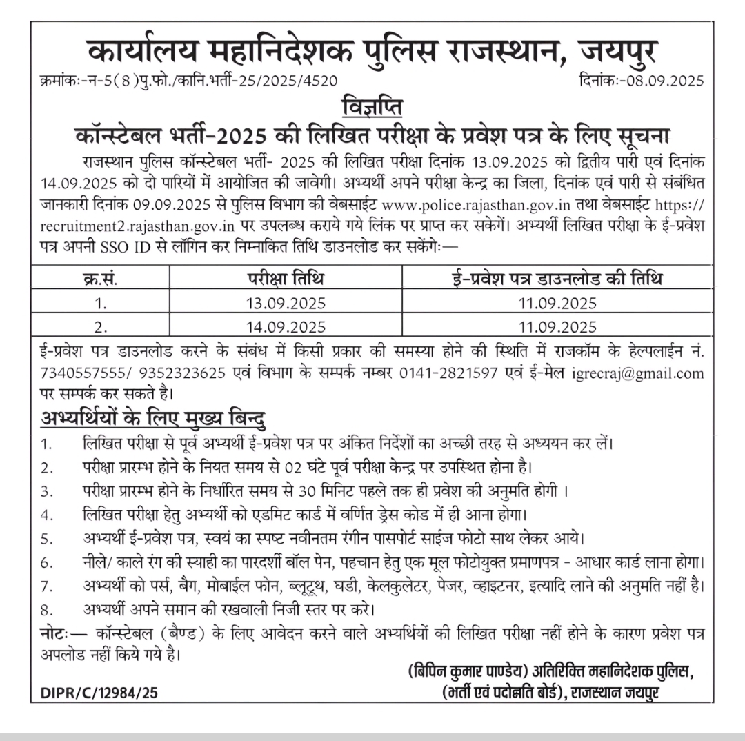 राजस्थान पुलिस कॉन्स्टेबल भर्ती परीक्षा-2025 (कुल 10,000 पद) की आधिकारिक उत्तर-कुंजी जारी, नीचे दिए गए लिंक से देखें उत्तर-कुंजी https://police.rajasthan.gov.in/portal/RecruitmentsResults दिए गए लिंक पर क्लिक करके संबंधित लिंक पर क्लिक करके देखें उत्तर-कुंजी परीक्षा केंद्र लोकेशन जारी, एडमिट कार्ड 11 सितंबर से होंगे डाउनलोड, राजस्थान पुलिस कॉन्स्टेबल भर्ती 2025 की लिखित परीक्षा की तारीखें घोषित […]