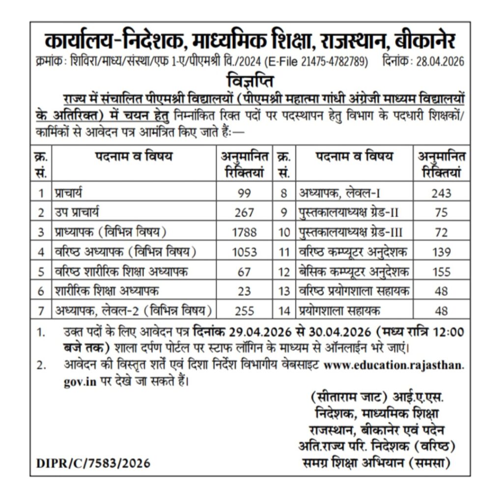 The 4,332 vacant positions in the state’s PM Shri schools will soon be filled. The Directorate of Secondary Education has invited online applications from teachers working in the education department through a portal from April 29th to 30th. Applicants from principals to laboratory assistants will be eligible to apply for these positions. The largest number of vacancies are for lecturers in various subjects, 1,788, and senior teachers, 1,053.